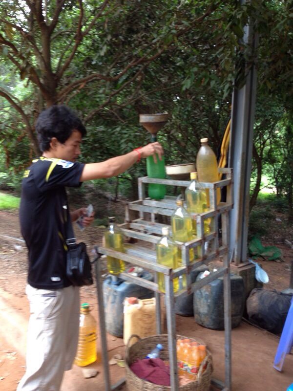 Durante i nostri giri in Tuk Tuk a Siem Reap abbiamo notato ai bordi delle strade, vicino alle classiche bancarelle che vendono frutta, acqua e alti prodotti locali la presenza di varie bottiglie contenenti un liquido giallastro e alquanto oleoso