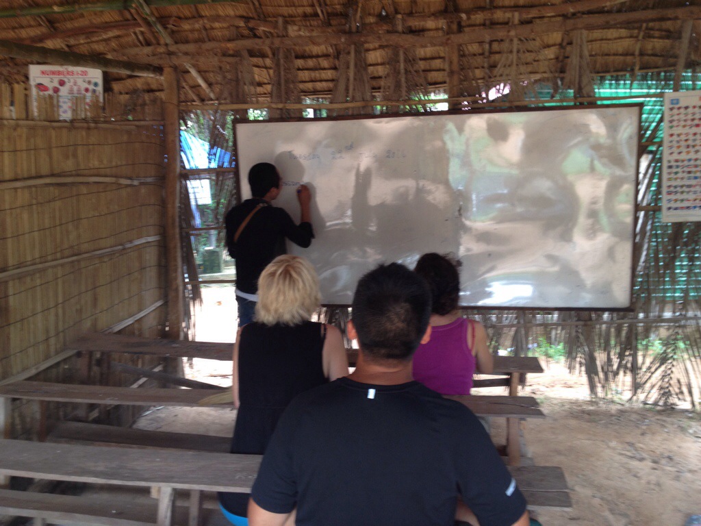 Circa 300 metri dopo il Wat, attraversando delle vie interne decisamente fangose (ma indossando le scarpe per noi è stata una passeggiatina facile facile!) abbiamo raggiunto una piccola struttura di paglia dove al di sotto sono stati inseriti dei banchi in legno e una lavagna