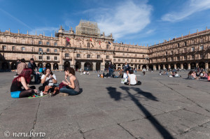 Dopo la salita delle torri, consigliamo di percorrere Rua Mayor che porterà in Plaza Mayor. Varcando la soglia di ingresso ci si rende conto di trovarsi in una delle piazze più belle della Spagna, punto di ritrovo di tanti studenti universitari che qui si danno appuntamento per mangiare, anche seduti per terra e scambiare due chiacchiere con amici e compagni di corso.