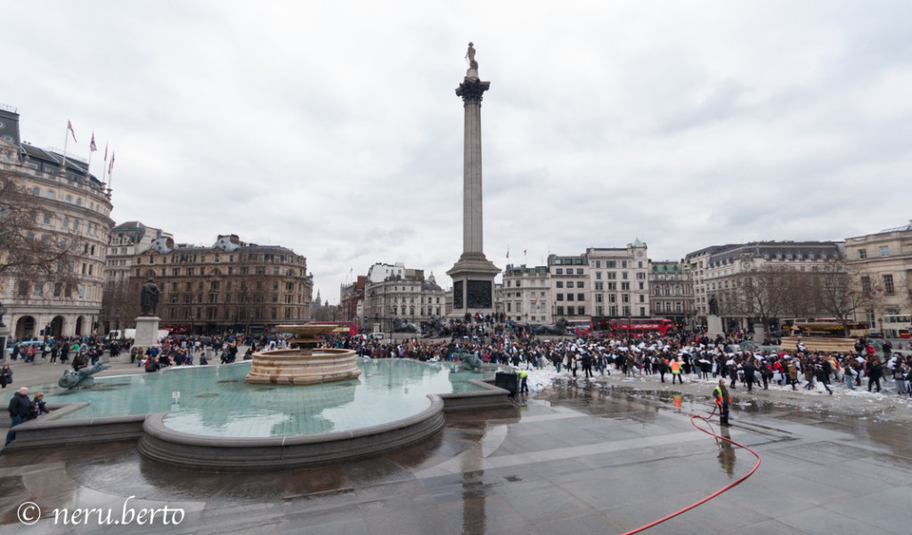 Dopo le prime cuscinate lanciate in Trafalgar Square tantissime piume hanno iniziato ad uscire dai cuscini e a liberarsi nell'aria, donando alla città un'atmosfera suggestiva ed unica.