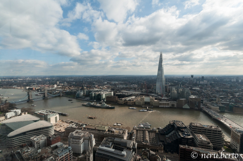 Prima di entrare nell'ascensore che ci riporterà con i piedi per terra, un ultimo sguardo al paesaggio intorno a noi, interrotto dall'emergere di un altro grattacielo, The Shard. E' stato progettato dall'architetto Renzo Piano e supera ogni altra costruzione in Europa. Si fa notare per la sua forma piramidale irregolare e dal luccichio dei pannelli di vetro che lo ricoprono.