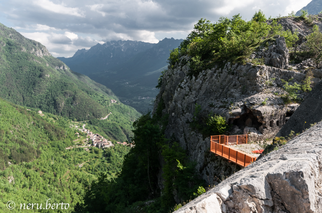 Lasciata la macchina al parcheggio, si inizia una breve ma altrettanto suggestiva passeggiata di circa 20 minuti. Fate attenzione a dove camminate, importante è seguire la linea delle enormi reti poste a qualche metro da terra per recuperare eventuali sassi caduti dalle montagne. Se ci si ferma a guardare il paesaggio circostante, vedrete una natura rigogliosa che percorre la vallata e qua e là qualche casetta in lontananza.