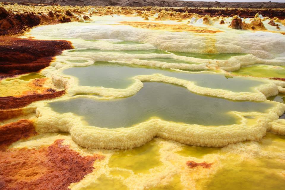 La zona vulcanica del Dallol, è un'area tra le più basse e calde della terra, dove gli etiopi estraggono il sale che poi viene caricato sui cammelli per trasportarlo per chilometri prima di arrivare a destinazione.
